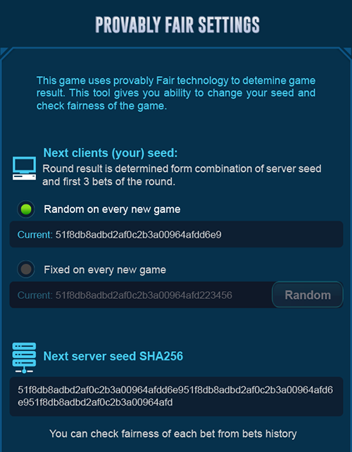 • တရားမျှတမှုကို သက်သေပြရန် ကျွန်ုပ်တို့သည် အလှည့်တစ်ခုစီမတိုင်မီတွင် သုံးစွဲသူမျိုးစေ့နှင့် ကျပန်းနံပါတ်ကို ပြသမည်ဖြစ်သည်။ ထို့ကြောင့် ကစားသမားများသည် ၎င်းတို့လိုချင်ပါက ၎င်းတို့၏ဖောက်သည်မျိုးစေ့များကို ပြောင်းလဲနိုင်သည်။